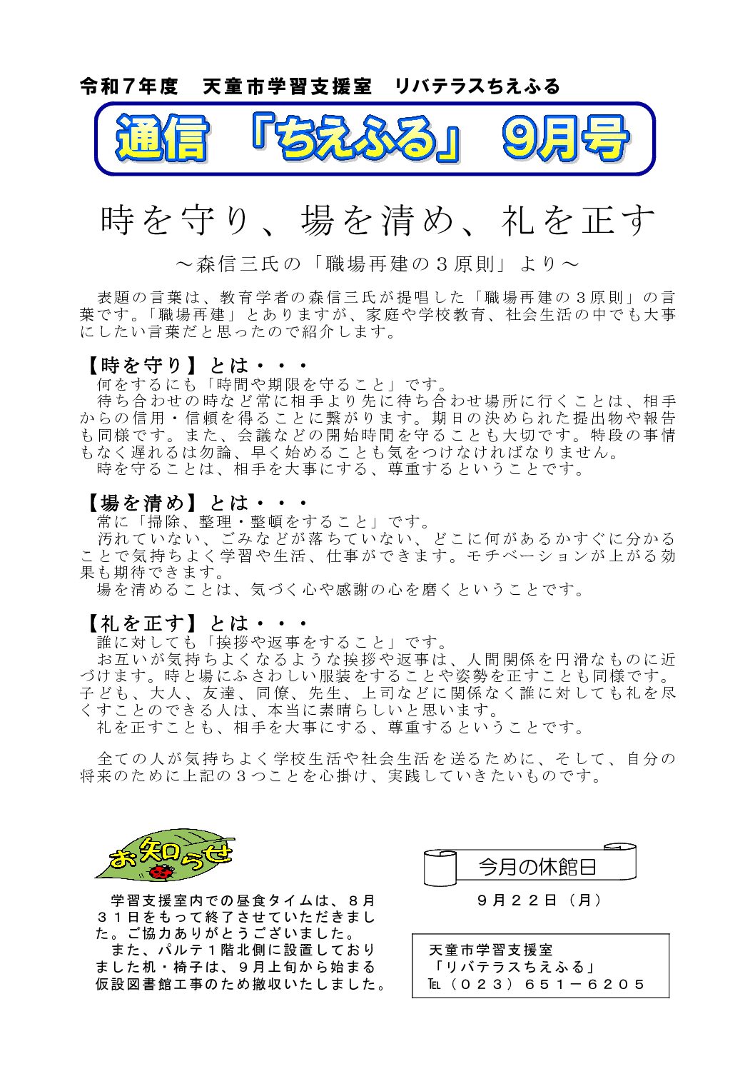 9月号のテーマは、「時を守り、場を清め、礼を正す」について紹介しています。 是非、ご覧ください ちえふる「9月…