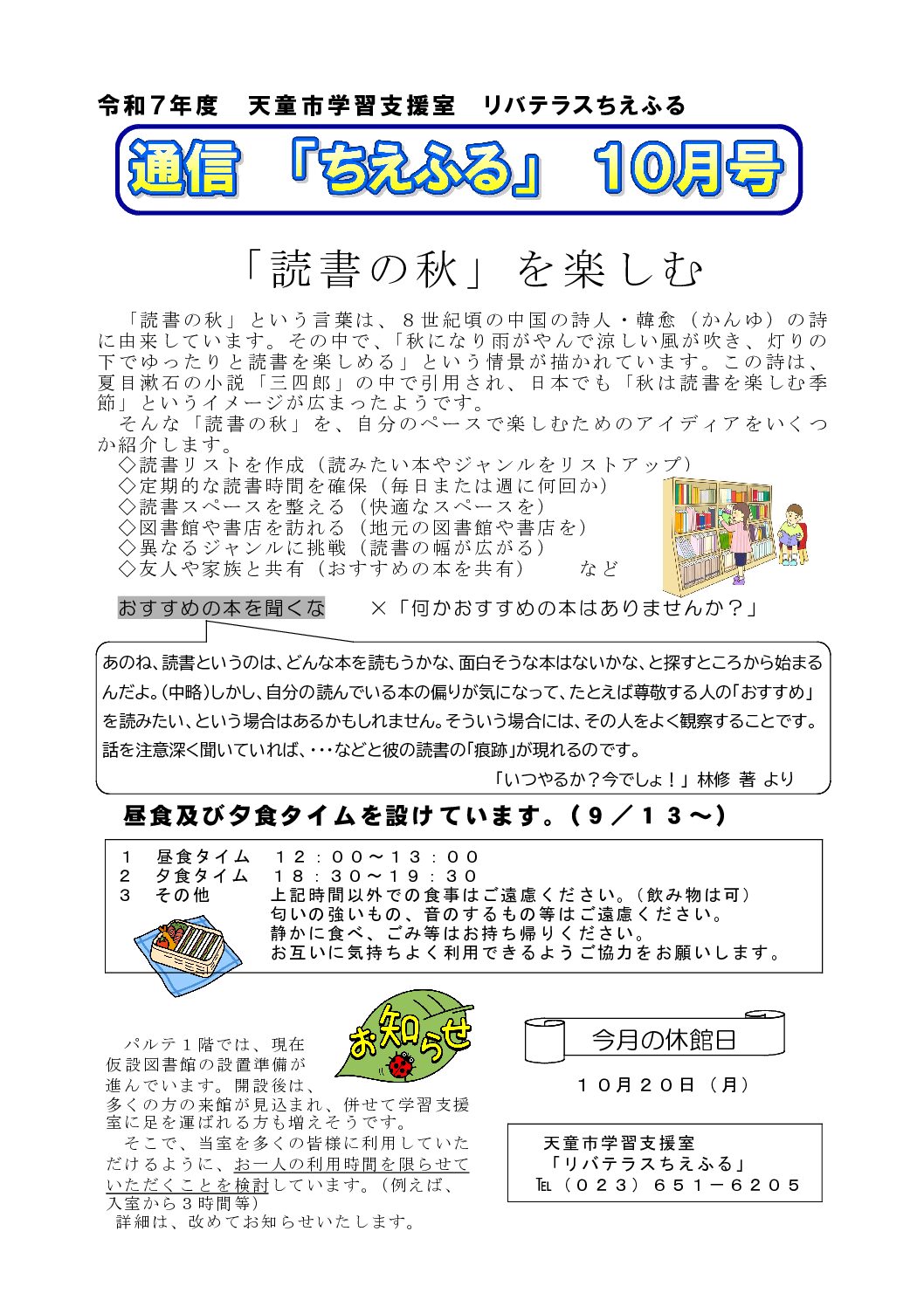 10月号のテーマは、(「読書の秋」を楽しむ)について紹介しています。 是非、ご覧ください ちえふる「10月号」…