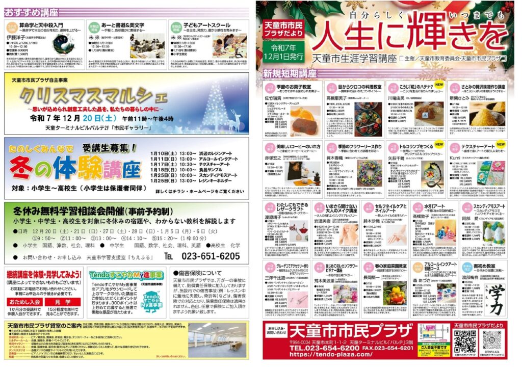 天童市市民プラザだより 令和7年12月1日号 2025年12月3日 最終更新日時 : 2025年12月7日 雅人花輪 一日集中講座や季節限定講座など盛りだくさんです。 天童市以外の方も受講できます。 お気軽にご参加ください。 FacebookXBlueskyHatenaCopy